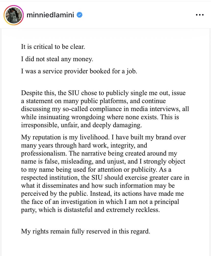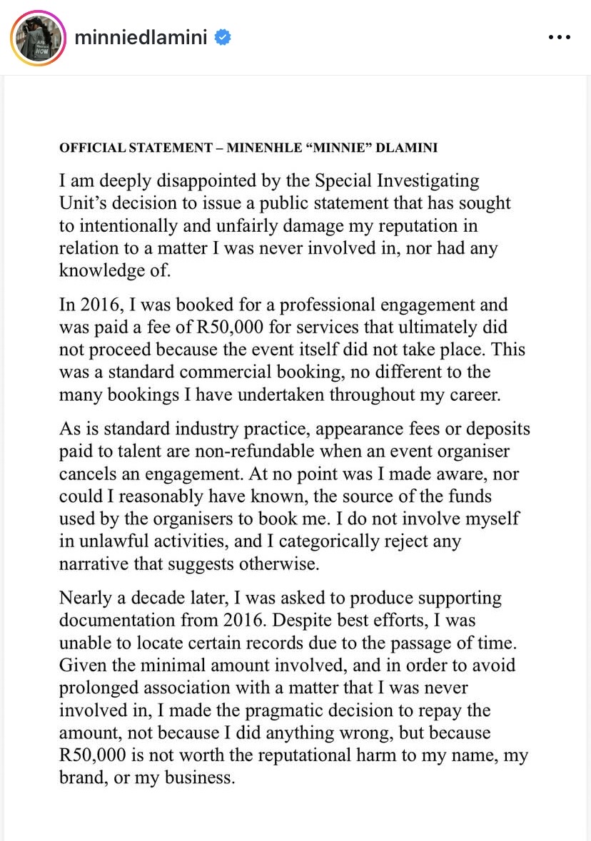 Minnie acknowledged that she received a booking fee of R50 000 to take part in the event but unfortunately the event was cancelled and according to her cancellation terms, a refund was not due to the organisers. However, following the investigation by the SIU, she complied and refunded the money in full.
